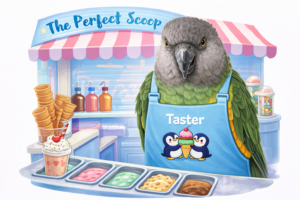 Jade is a 23-year-old African Senegal Parrot and the true brains behind The Perfect Scoop. While Mommy and Daddy are busy managing the shop, Jade is at home overseeing the real work—payroll, QuickBooks, and all major business decisions.